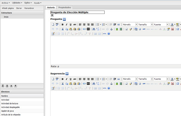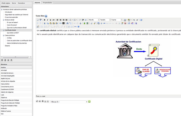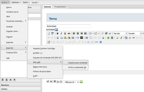 This editor of educational content also allows us to export lessons such as web pages or as IMS, SCORM or Common Cartridge packages being possible their legal reuse by possessing the Creative Commons license to serve as a base or component of another resource.